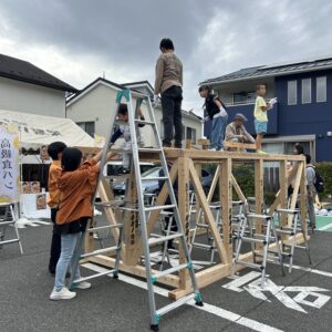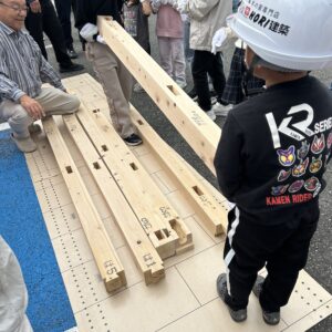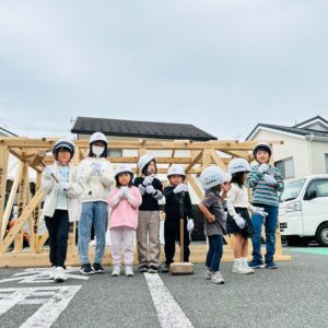 気分は本物の大工棟梁さん。大工さんに教わりながら、こども達だけで小さなお家の構造を組み上げます。