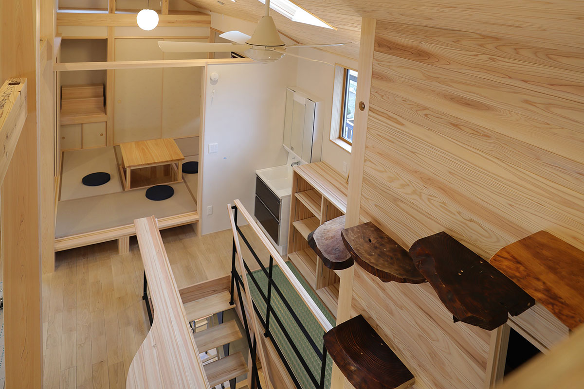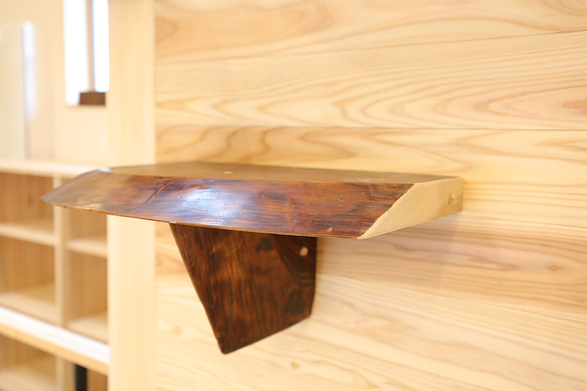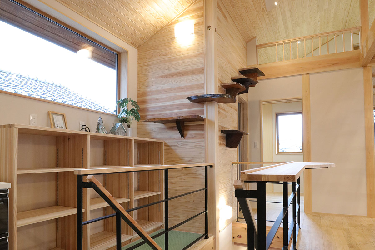 2階に設けた明るいリビング。無垢材の壁には、愛猫のためのキャットウォークを設置。施工時に出た端材を利用したキャットウォークは、いろいろな木の表情を楽しめるアクセントになっています。愛猫がのびのびと動き回る姿に、家族の笑顔が広がります。人にもペットにもやさしい、快適で心地よい木の家です。明るい2階リビングにキャットウォークを設置。無垢材の端材を活かした造作は、猫にもうれしく、家族にも楽しいアクセントになっています。