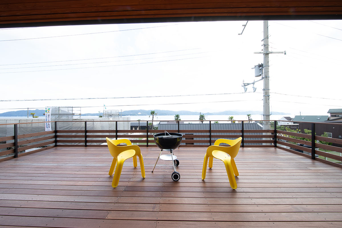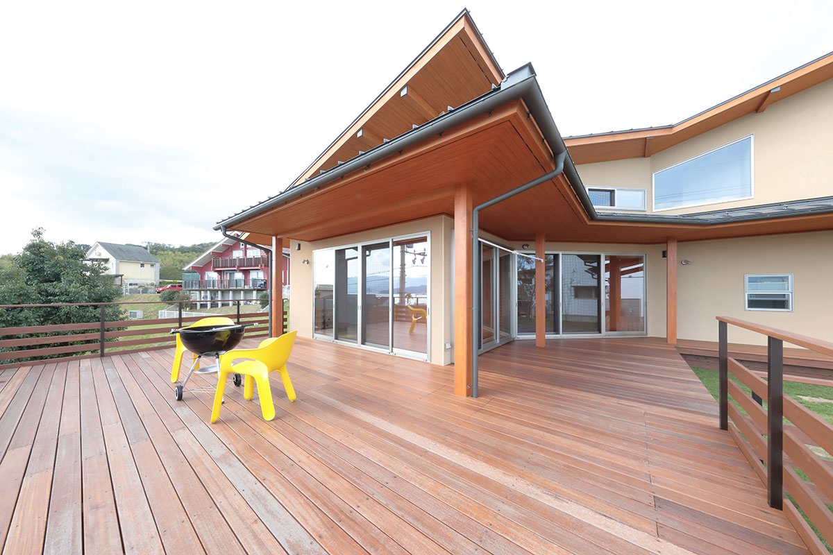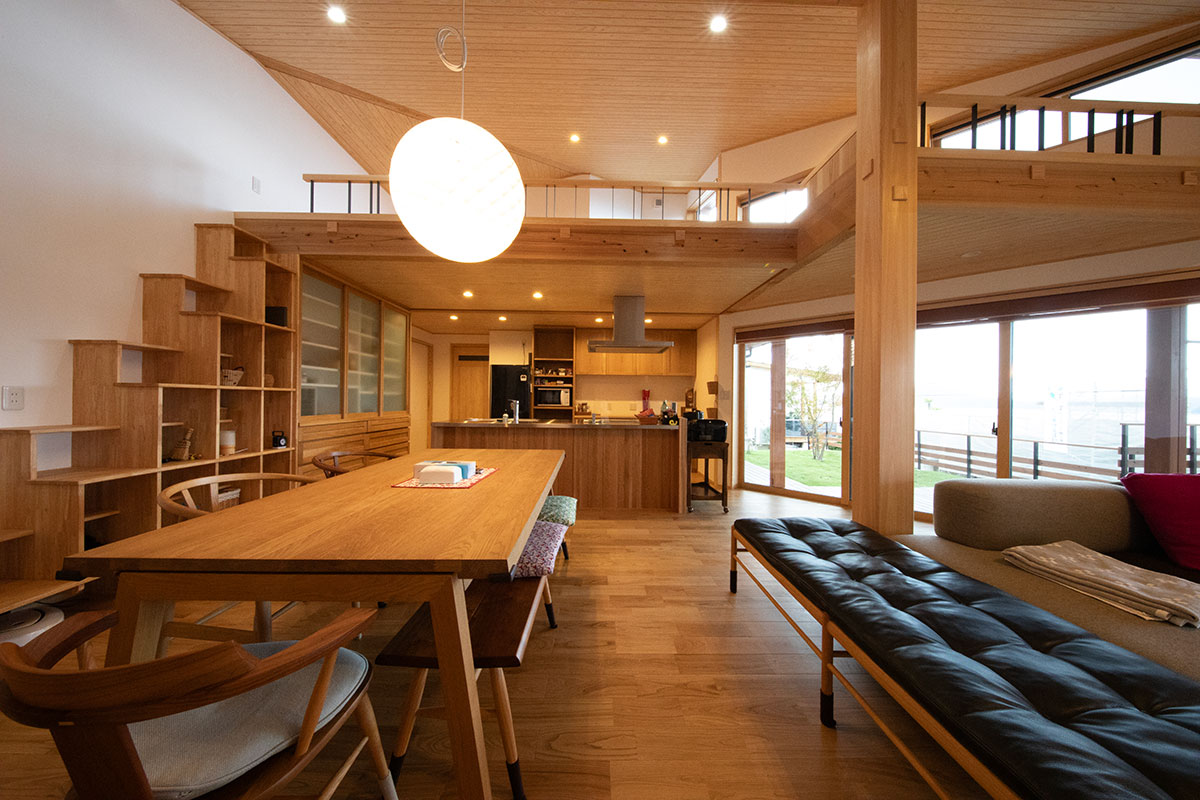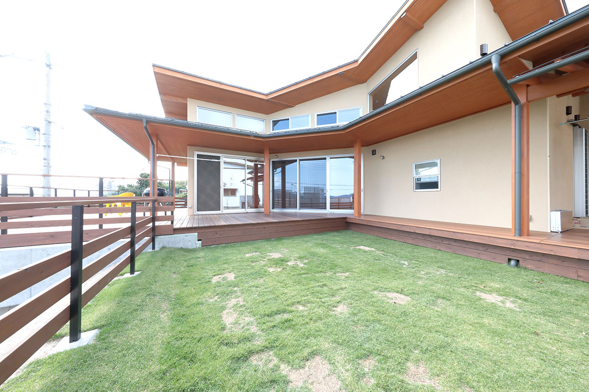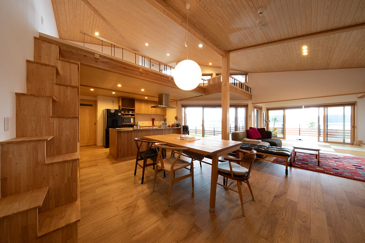 大きな窓から海を一望できる明るいリビング。無垢床のやさしい感触が心地よく、夏は涼しく冬は暖かい快適な空間です。広い庭とウッドデッキは、愛犬が思いきり走り回れる遊び場に。家族とペットが自然の光と風を感じながら、健やかに心地よく暮らせるお住まいです。