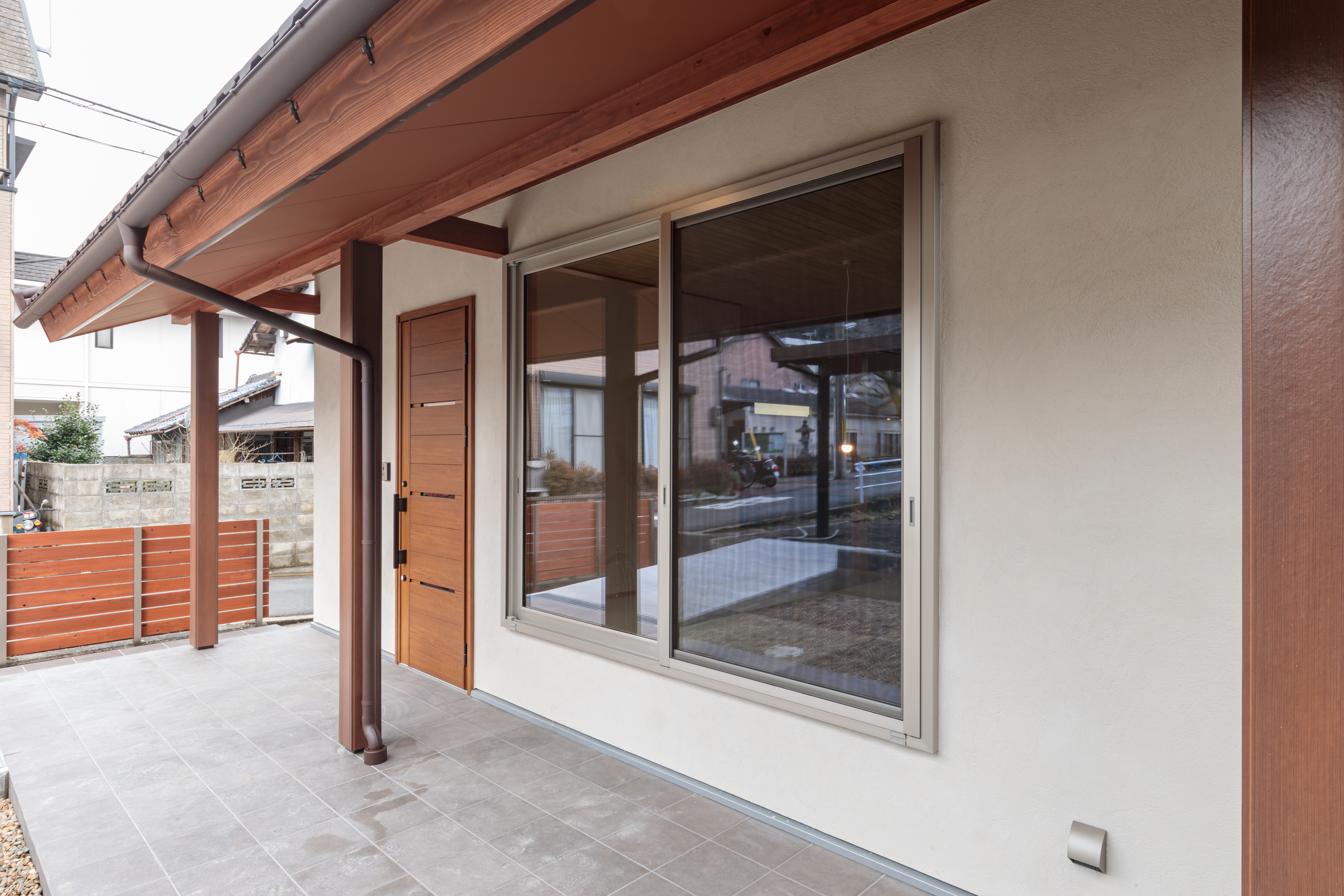 玄関からお庭へと広がる軒深のタイルデッキ。大きなサッシから柔らかな光が差し込み、内と外が心地よくつながります。