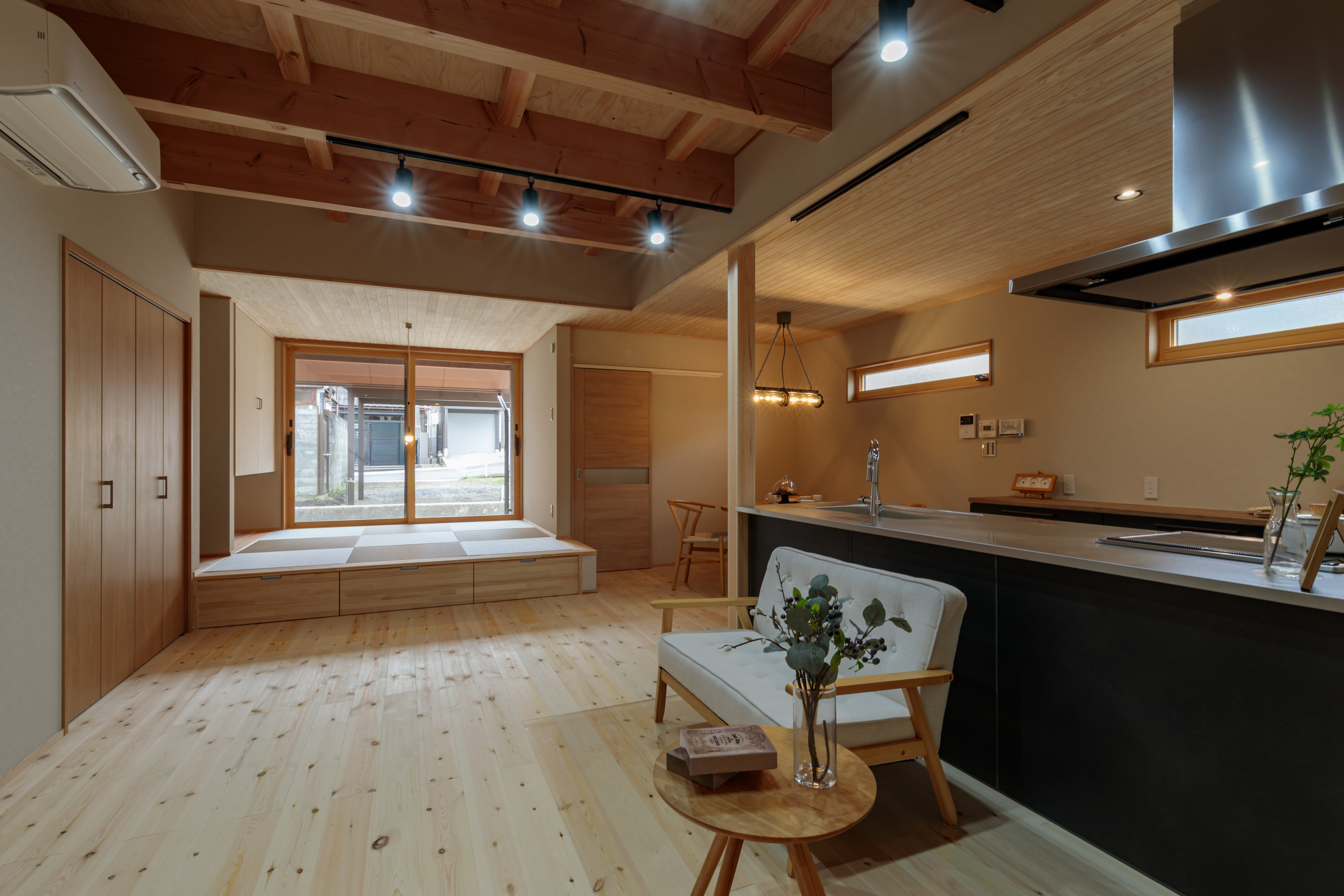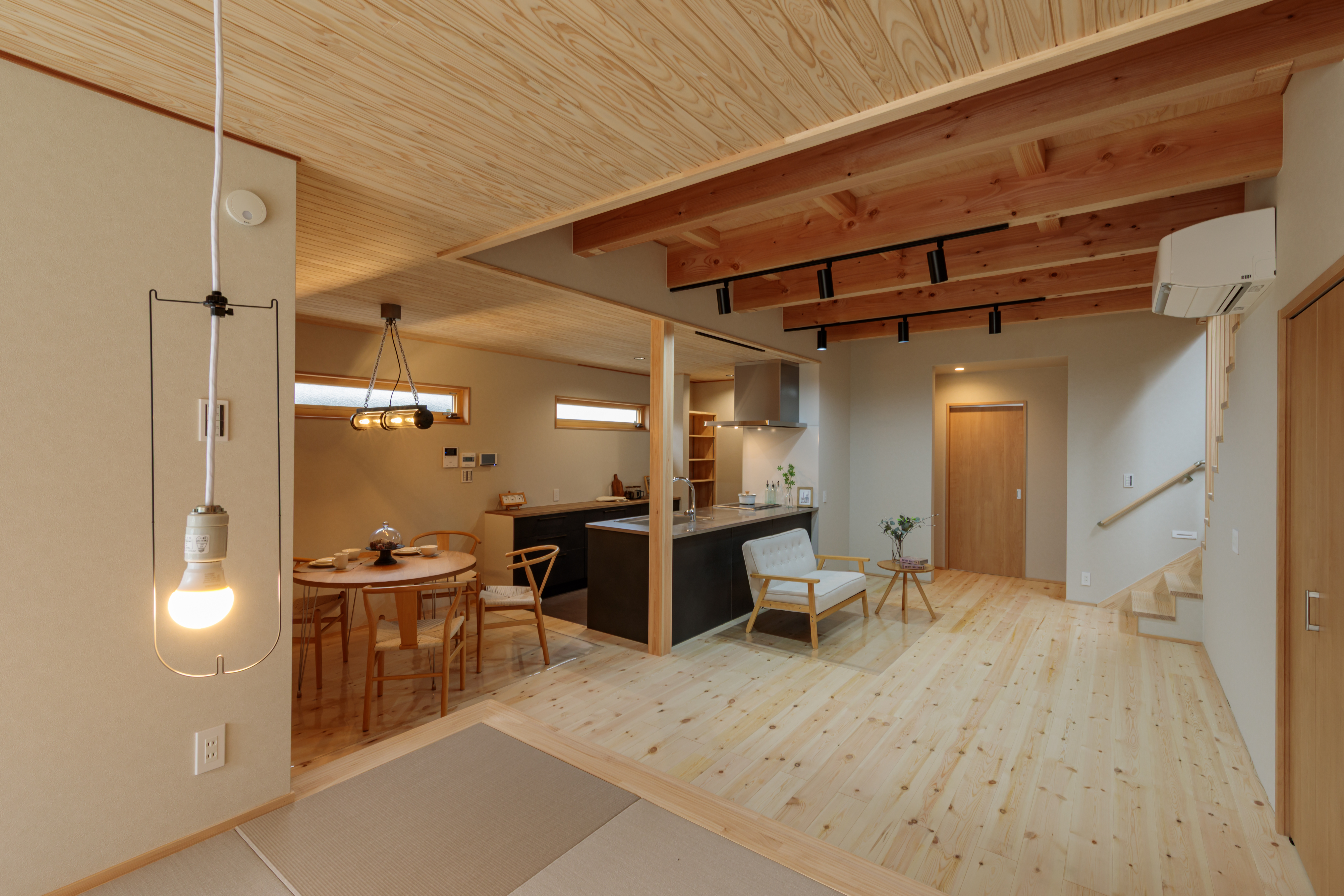 20畳の広々としたLDKには、柔らかなパイン材の無垢床と、杉の羽目板天井を。深呼吸したくなるような木の香りと温もりは、小さなお子様にも安心。