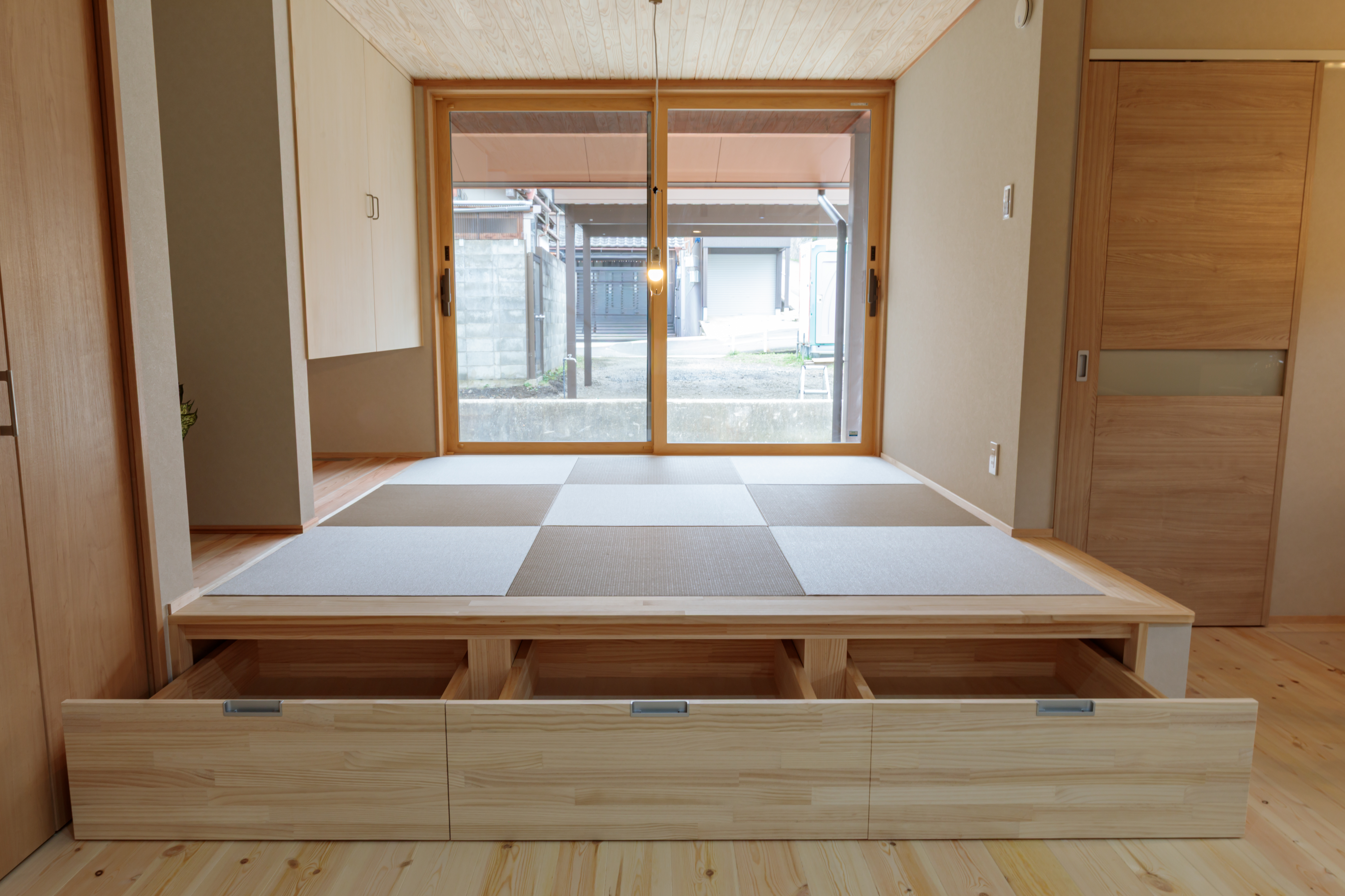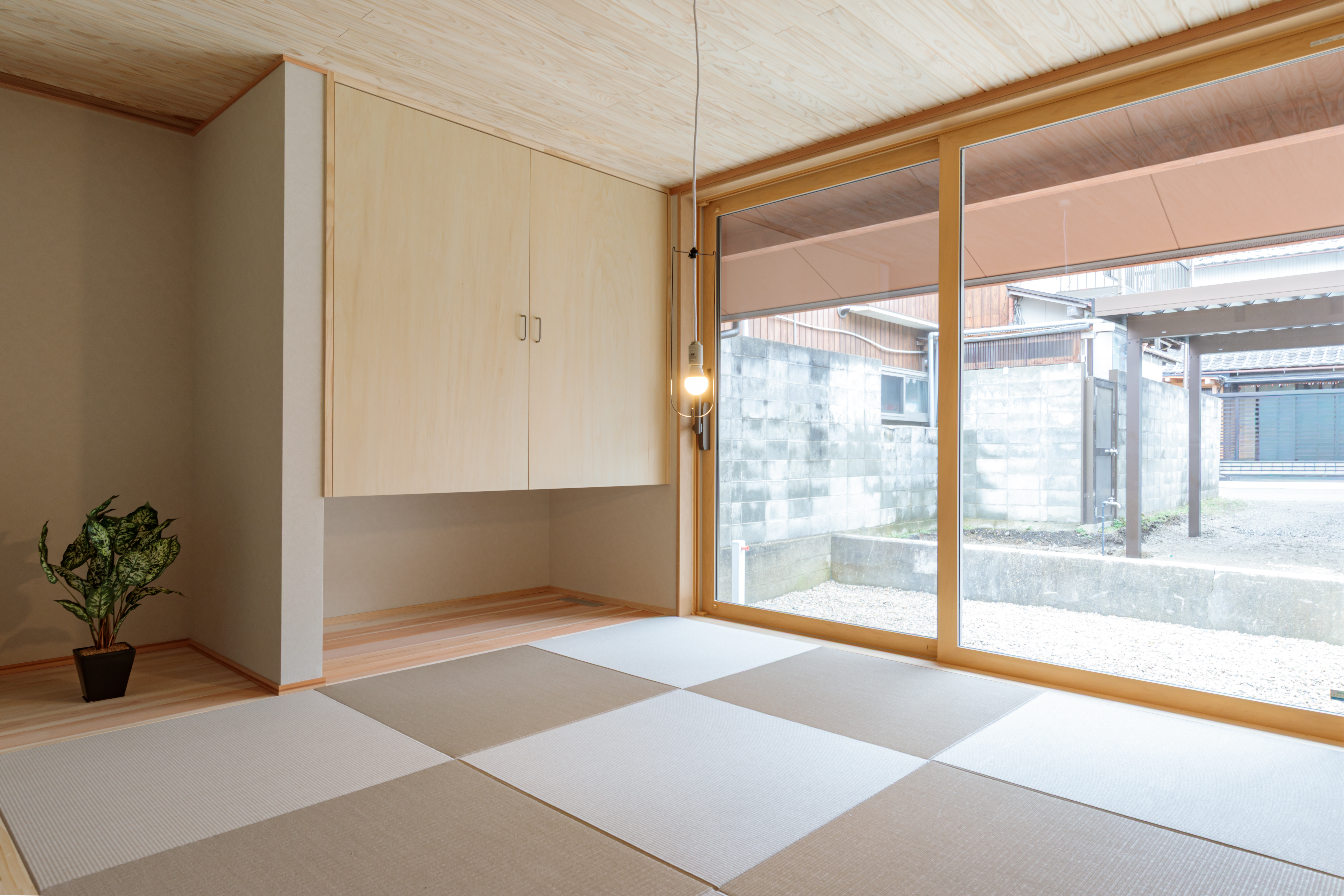 窓から差し込む光が、優しいニュアンスカラーの和紙畳を照らします。お昼寝も、読書も、家事の合間のひと休みも。家族みんながほっと癒される場所です。
