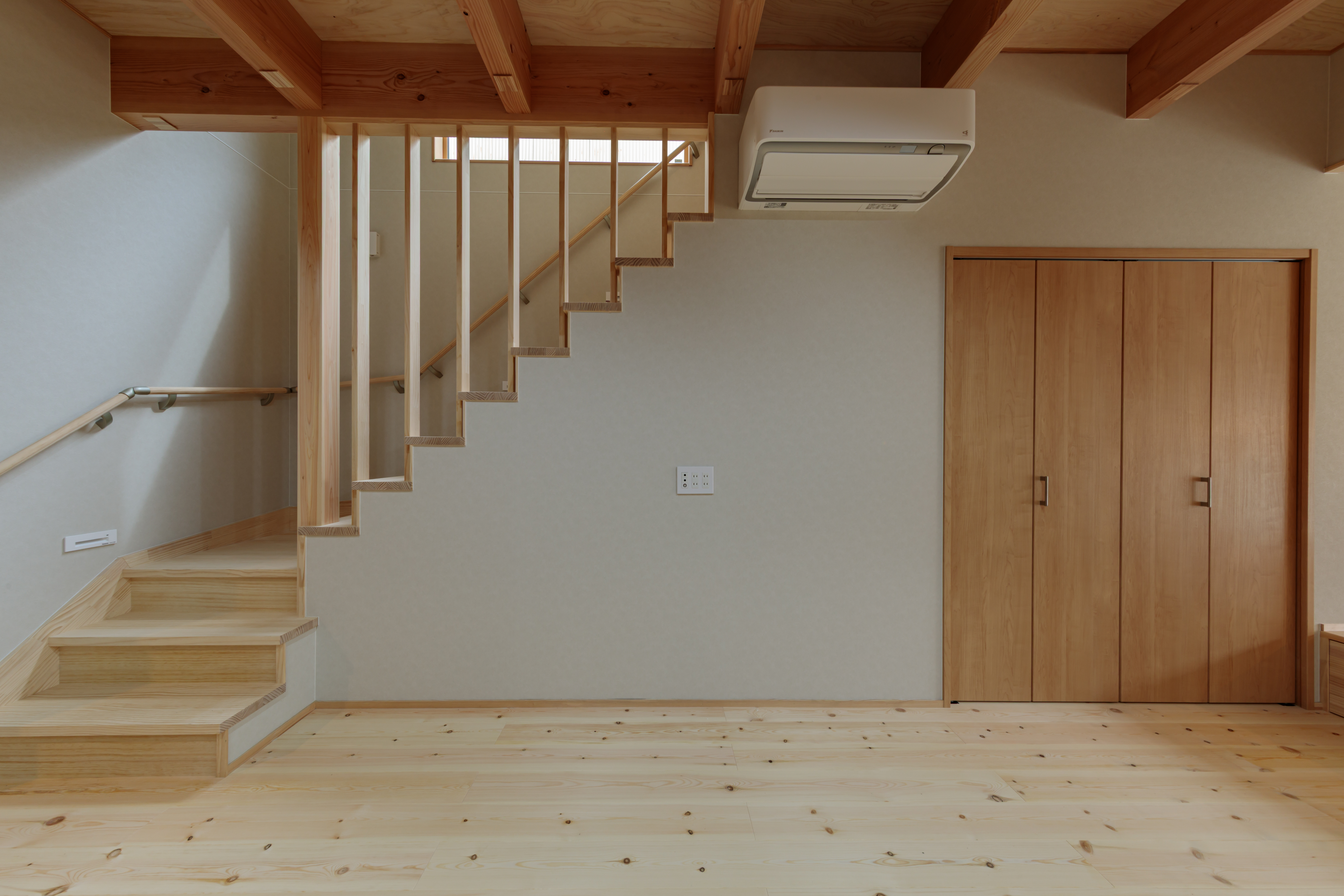 1階と2階をゆるやかにつなぐリビング階段。家族が必ず顔を合わせる設計が、日々の何気ない会話を育みます。