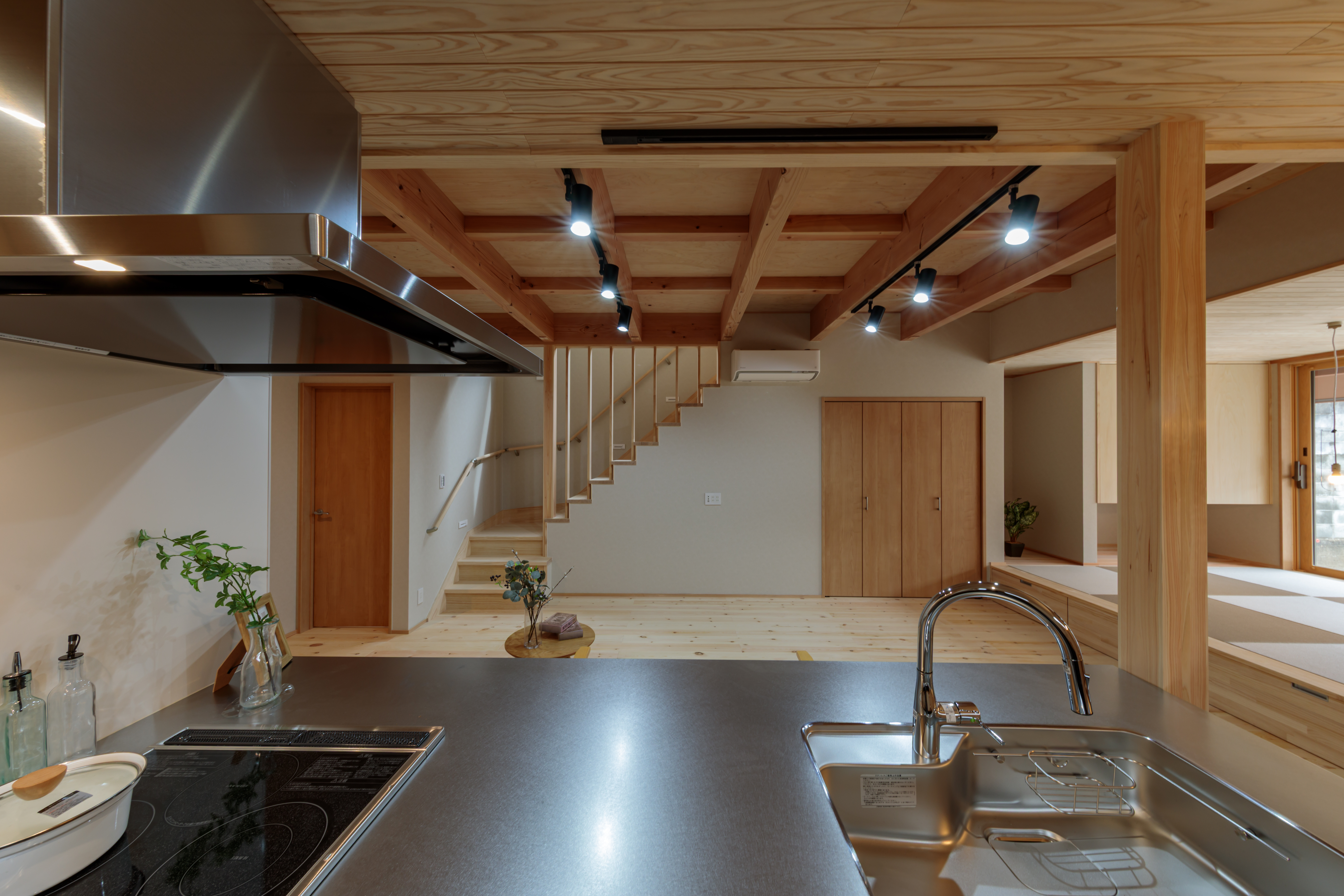 料理をしながらLDK全体が見渡せる対面スタイル。リビング階段や小上がり和室で過ごすお子様を、キッチンから優しく見守れます。