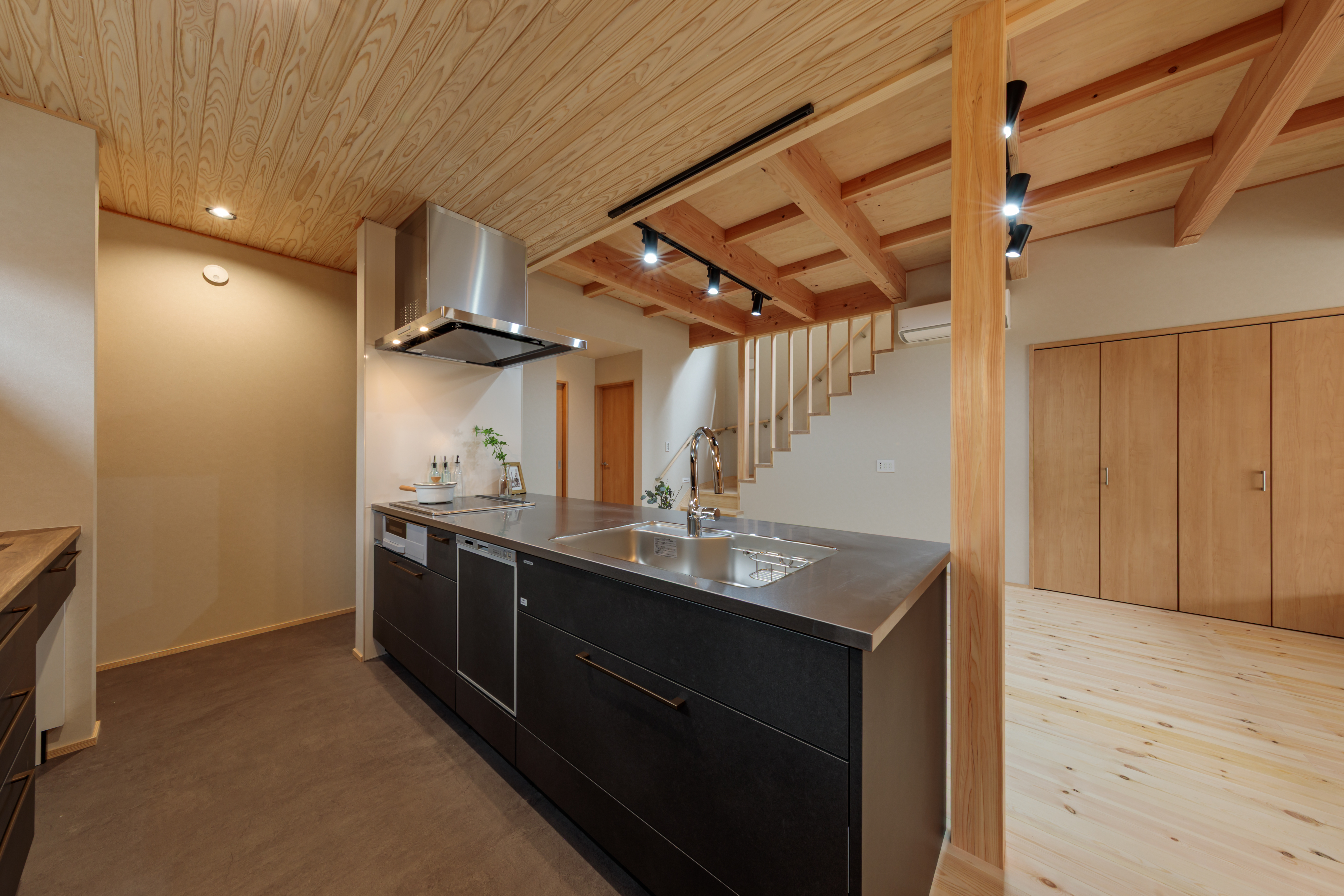木の質感を楽しむ空間にブラックのキッチンが上質なアクセント。自然素材の優しさと、モダンの機能美が美しく調和する、ナチュル&シックなスタイルです。