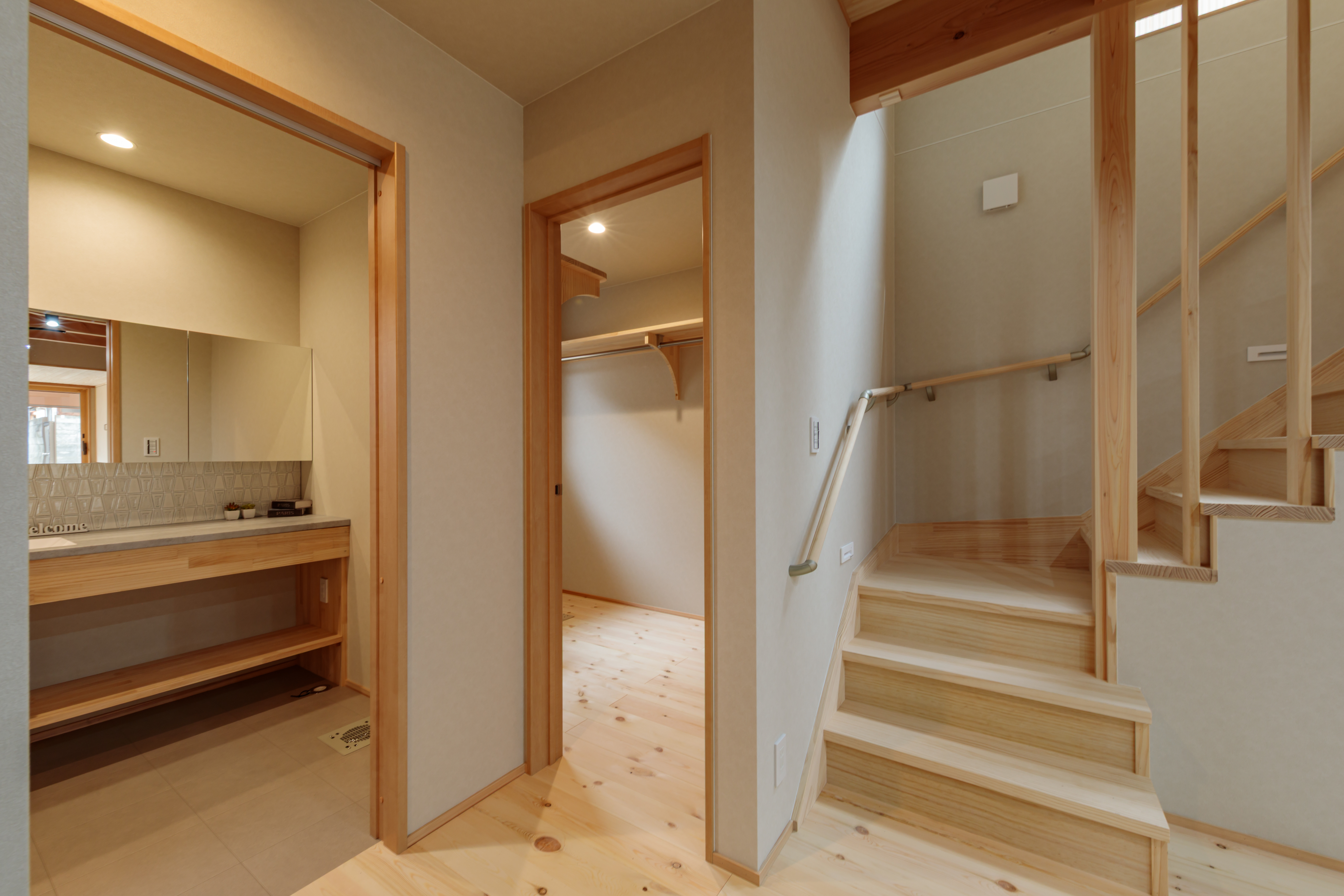 家事を「線」でつなぐ。理想の家事ラク動線。リビング階段のすぐ横には、洗面脱衣室・バスルーム、そしてファミリークローゼットを集約。「洗う・干す・しまう」が数歩で完結する動線が、忙しい毎日にゆとりを生み出します。