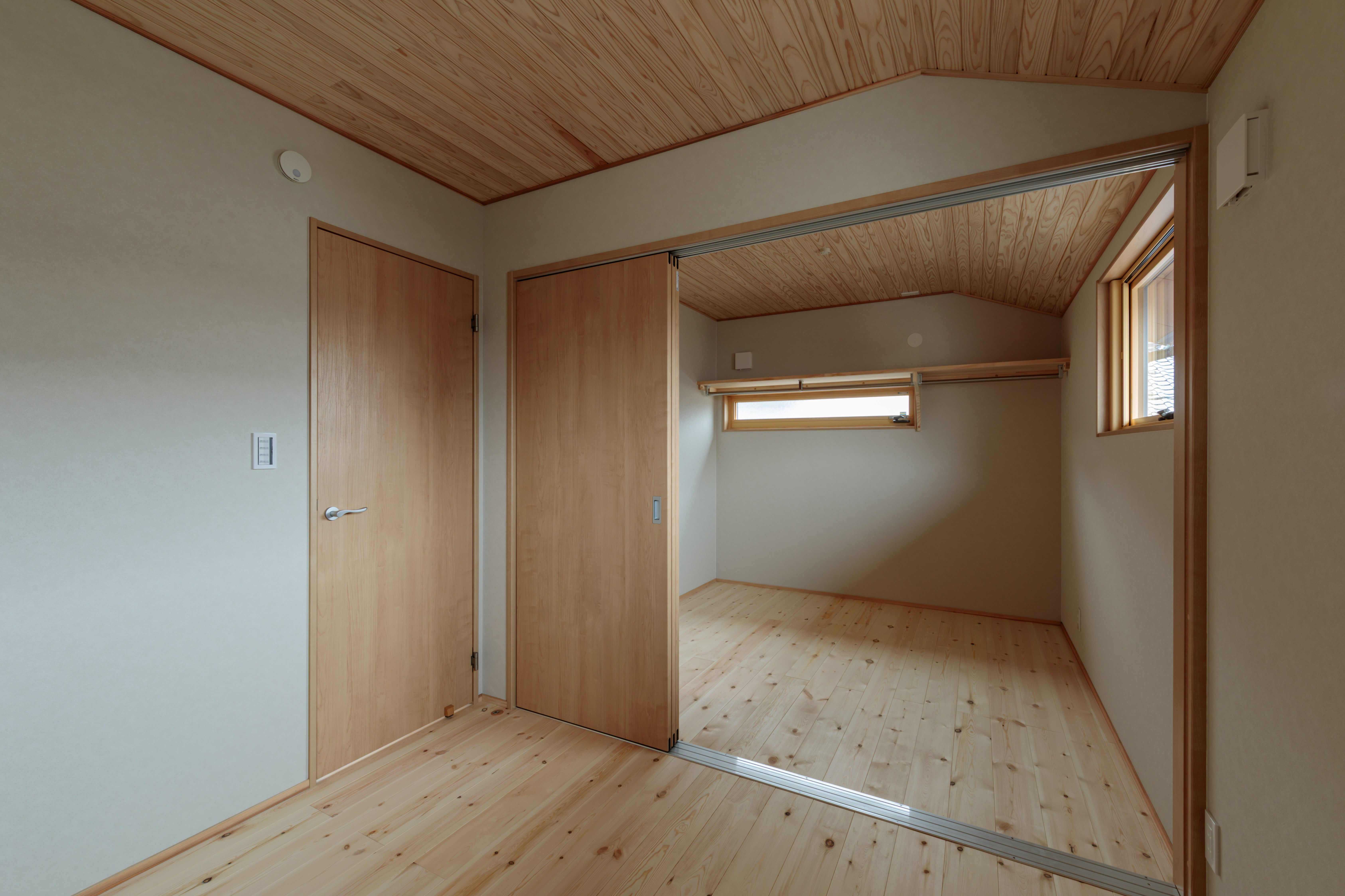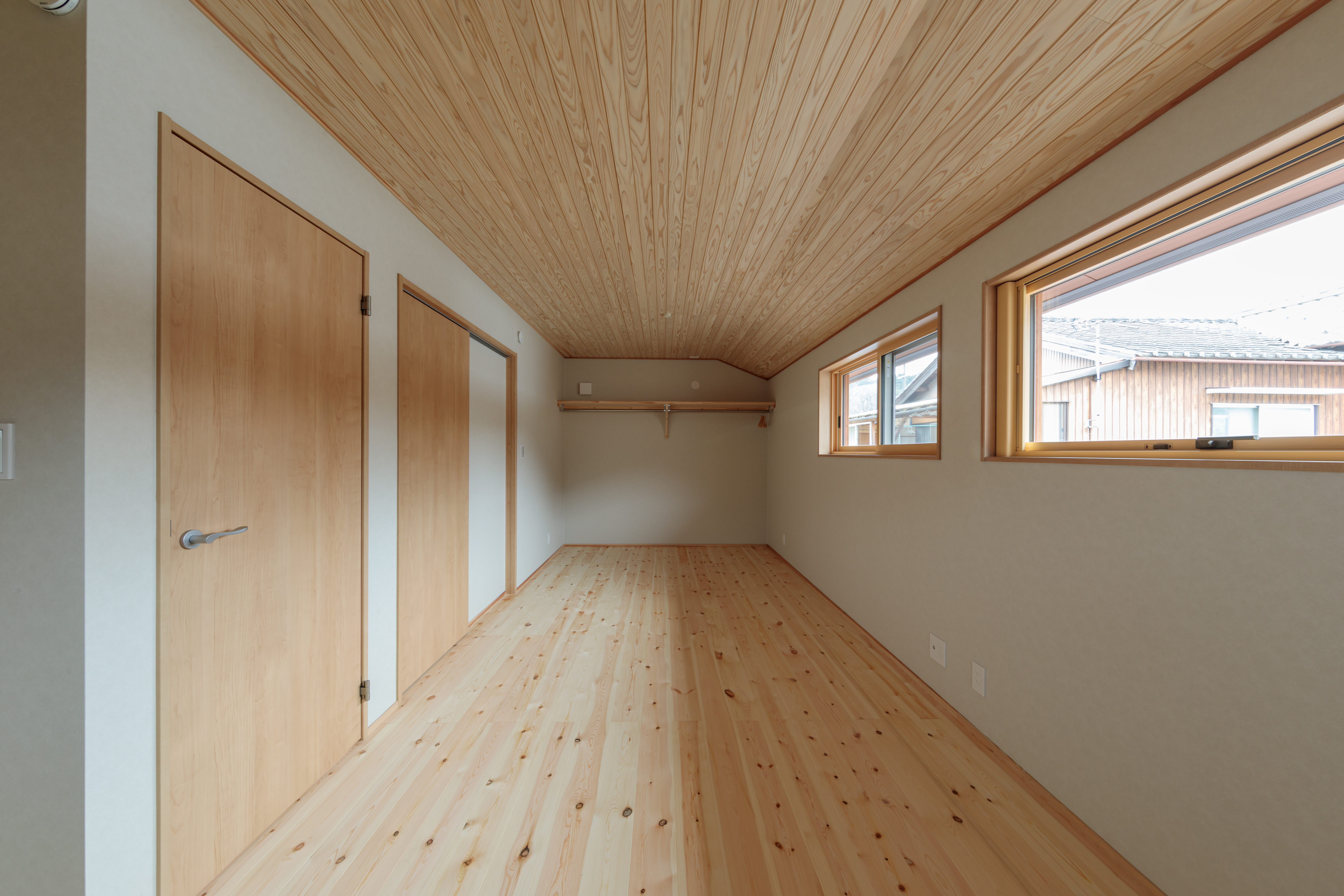 のびのび育む、約12畳の子ども部屋。小さいうちは兄弟で仲良く。個室が必要な時期が来たらセパレートに。木の香りに包まれながら、お子様の自立を優しく見守る住まいです。